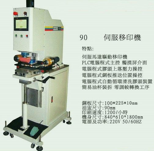 b.大型半自動(dòng)移印機(jī)。大多采用電子電路控制執(zhí)行部件,完成上墨、刮墨、膠頭提墨、再轉(zhuǎn)向工件的全過(guò)程。動(dòng)作的速度和壓力都可調(diào),也可由電腦設(shè)定,按既定要求重復(fù)作業(yè)。